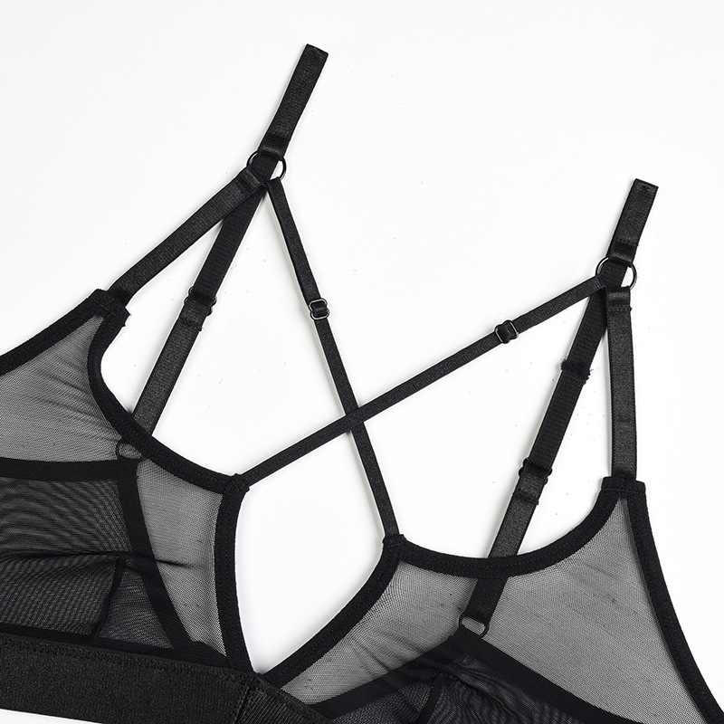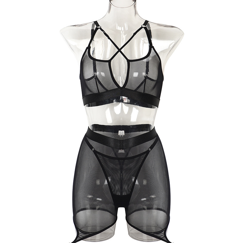 Solid Color Sheer Mesh Cross Sexy Shapewear Three Piece Set