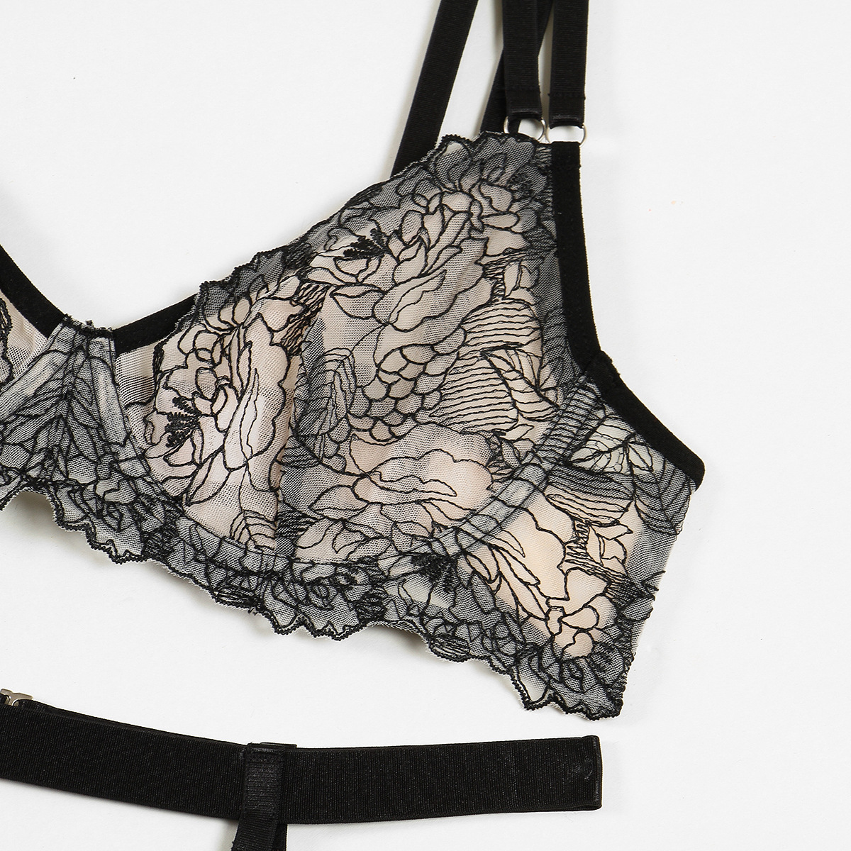 Summer Sexy Underwear Collar Garter Suit Embroidered Mesh Splicing See Through Sexy Five Piece Set