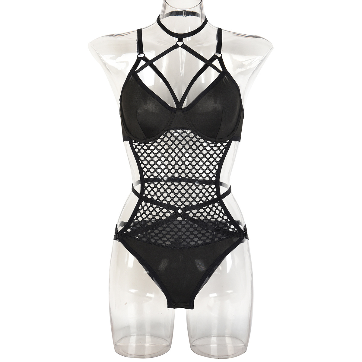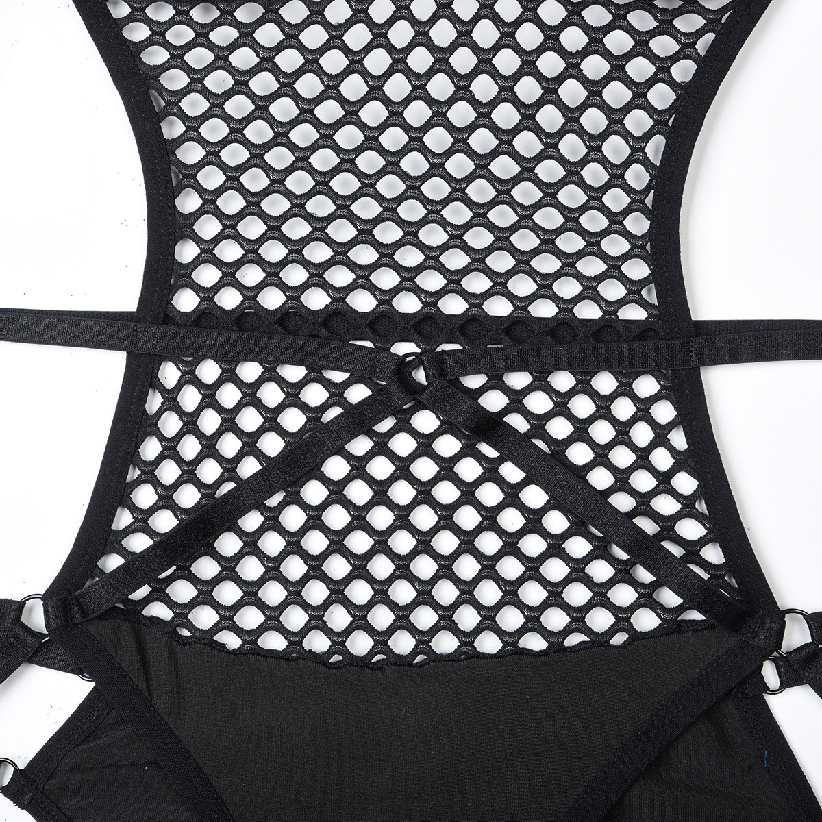 Trendy Large Mesh Hole Hollow Out Cutout out Complex Cross Strap Sexy Inner Wear Jumpsuit Hidden Hook Detachable