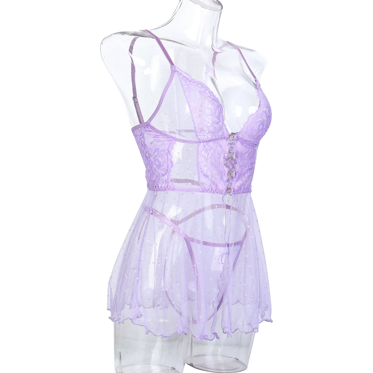Women Clothing Underwear Sexy Polka Dot Sheer Mesh Lace Crystal Buckle Pure Shu Slip Nightdress Two Piece Set