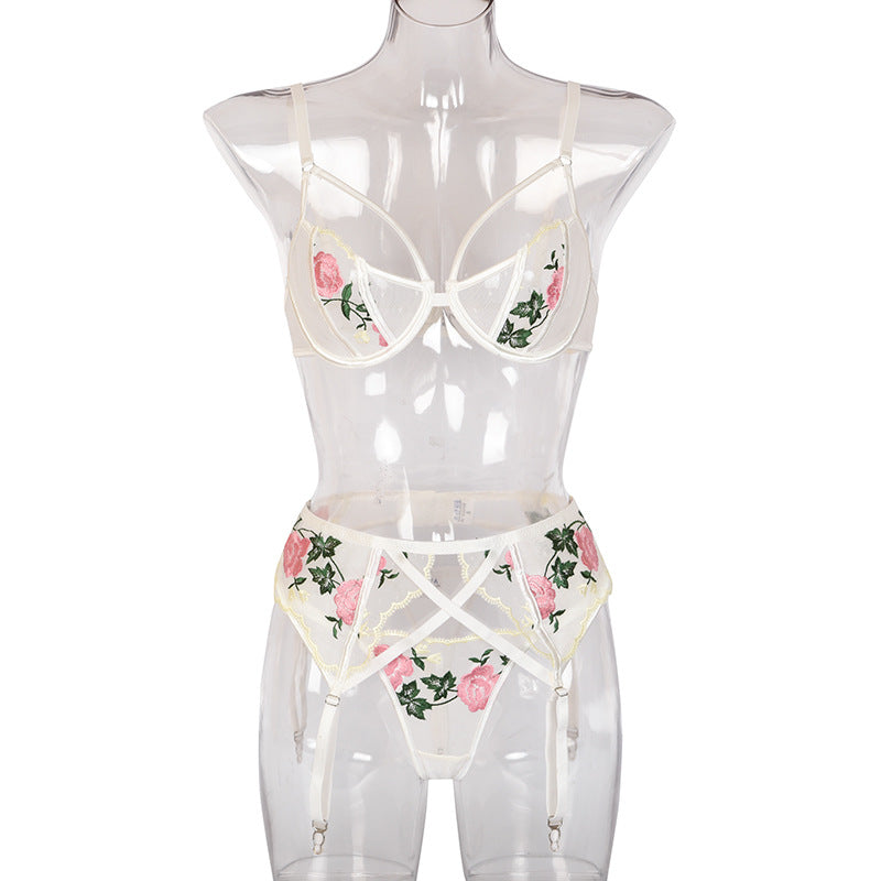 Women Wear Classic Embroidery Heavy Craft Lace Mesh Underwear Gathered Three Piece Set
