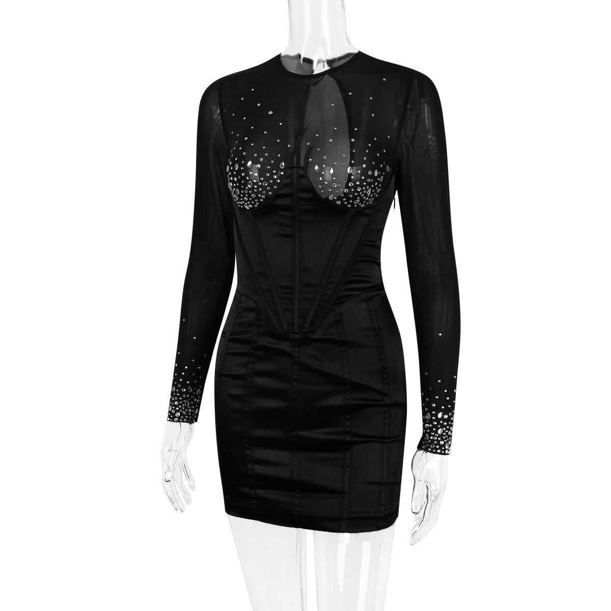 Women's Hot Rhinestone Fishbone Hot Girl Skinny Hip Skirt Black Dress